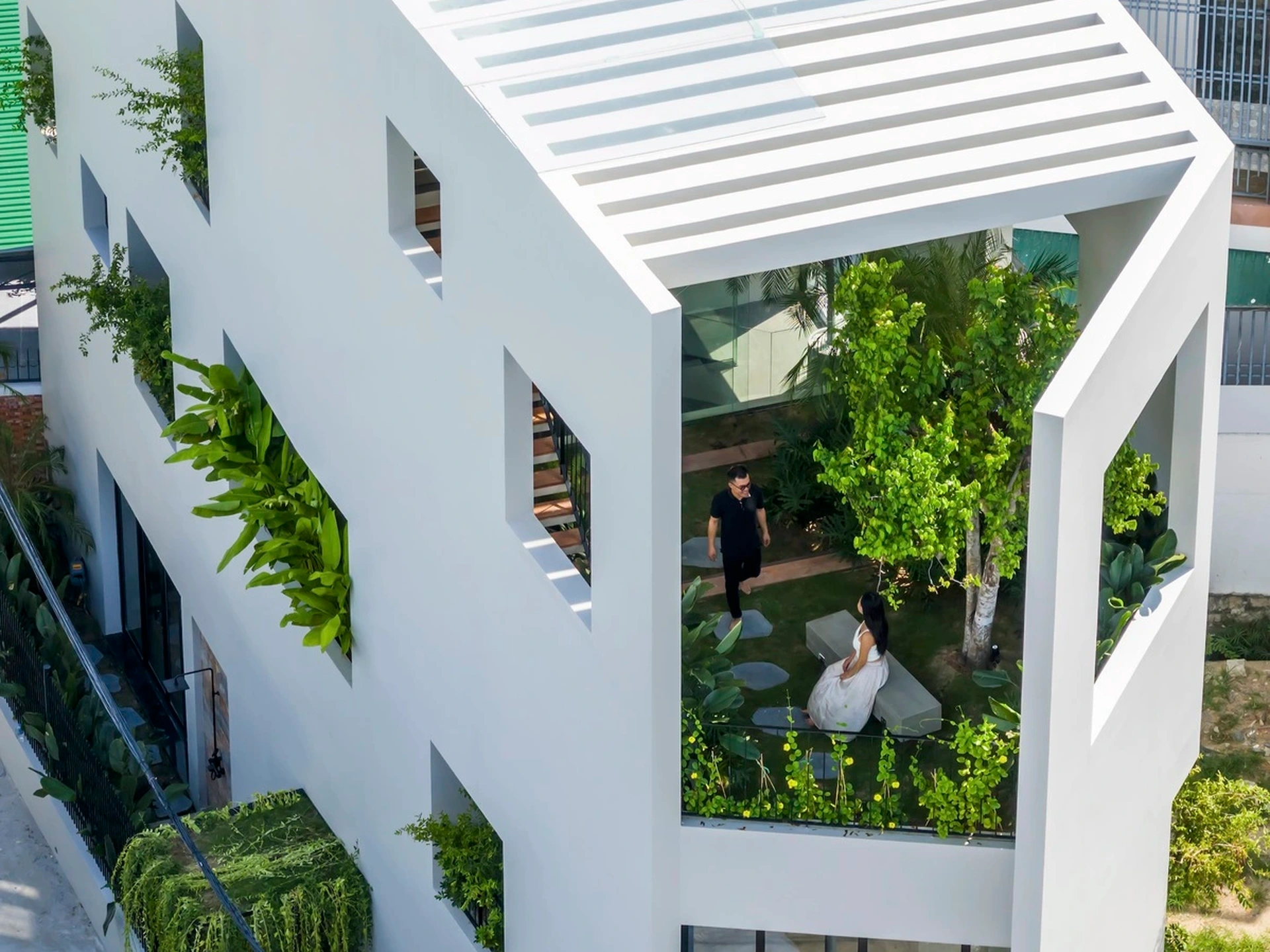 Cây xanh được bố trí xung quanh phòng ngủ và khu vực vệ sinh, mô phỏng những khu vườn xanh. Đó cũng là những bức tường xanh ngăn bụi từ bên ngoài, cải thiện chất lượng không khí.